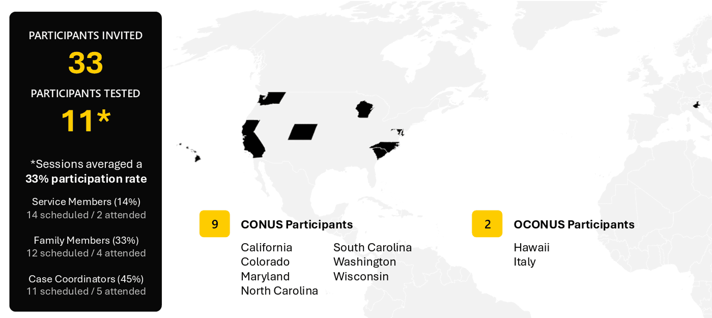We partnered with stakeholders to recruit participants across 11 CONUS and OCONUS locations. I managed scheduling and coordination end-to-end, organizing sessions, sending communications, and ensuring participant readiness. Each 30-minute session was facilitated by a designer, with stakeholders invited as silent observers to build visibility into user behavior.