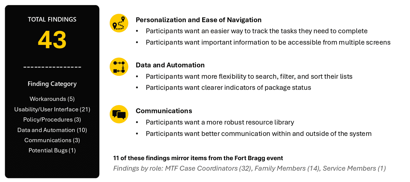 I partnered with a business analyst and fellow designer to plan and coordinate the research initiative. While the survey was ultimately paused due to restrictions around engaging military families, we adapted our approach—leading a 4-day in-person user feedback event at Fort Bragg alongside three targeted virtual usability studies to ensure we still captured meaningful user insights.
