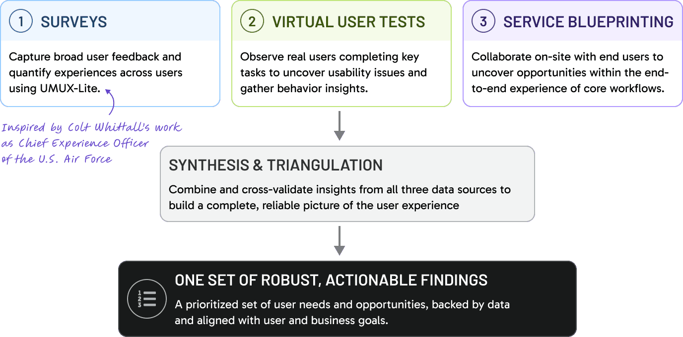 To address these gaps, I proposed a mixed-method research strategy combining in-person service blueprinting, remote usability testing, and a supporting survey to capture both qualitative and quantitative insights. The approach was designed to triangulate findings across supplementary methods, ensuring a comprehensive view of user needs, behaviors, and pain points.